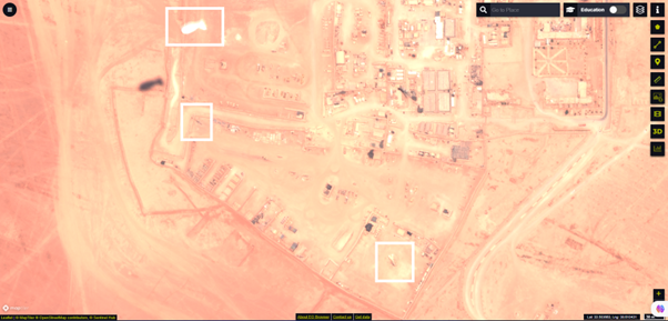 رصدنا كذلك من خلال صور الأقمار الملتقطة بتاريخ ٤ سبتمبر 2023 من Sentinel Hub مقاتلة في المحيط المباشر لقاعدة التنف، وهو ما يعبر عن نشاط عسكري جوي بأجواء القاعدة: