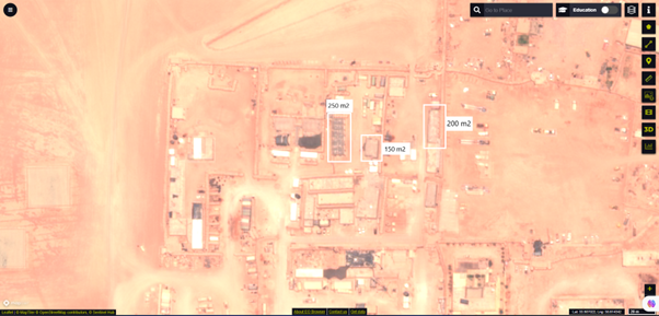 وقد كشفت صور الأقمار الصناعية -كذلك- عن عمليات حفر وتعبيد، قامت بها عدة مركبات شرق هذه المباني الثلاثة، حيث ظهرت رقعة ترابية كاملة تبلغ مساحتها 16,000 لم تكن مستغلة سابقاً، ويبدو من موقع عمليات الحفر ومساحتها أنها عملية إنشاء لمخاز عتاد او حظائر مركبات عسكرية.