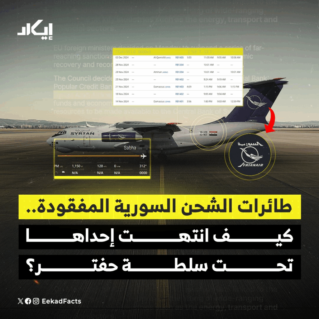 بينما كان فريق تحقيقات إيكاد يتابع تحركات أسطول طائرات الشحن السورية، برزت أمامنا معلومة مثيرة، تظهر أن إحدى الطائرات التي اختفت قبيل سقوط الأسد، أصبحت اليوم تحت سلطة خليفة حفتر.