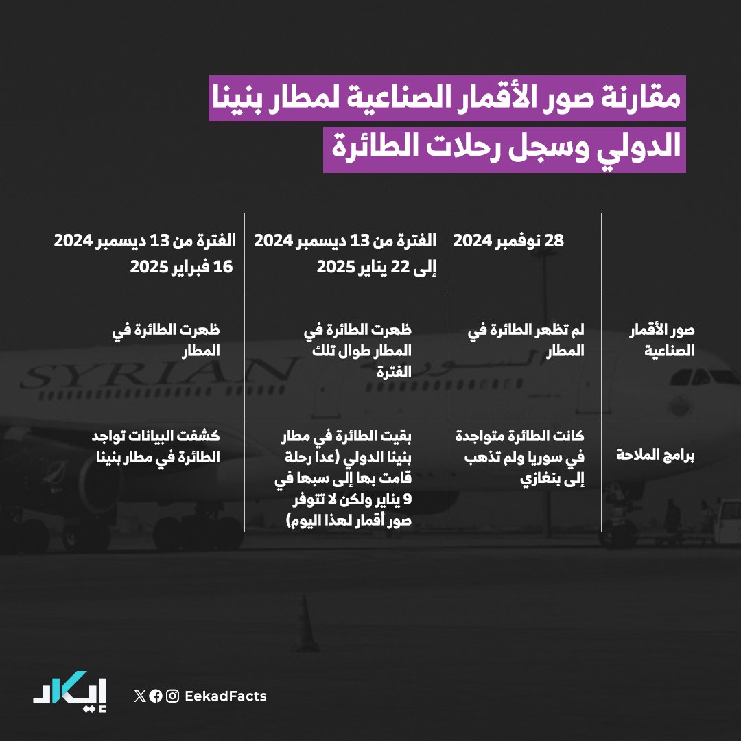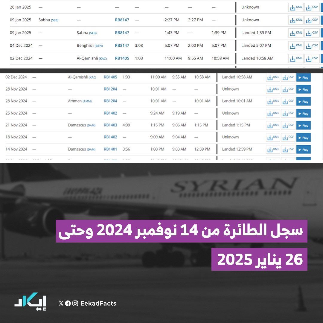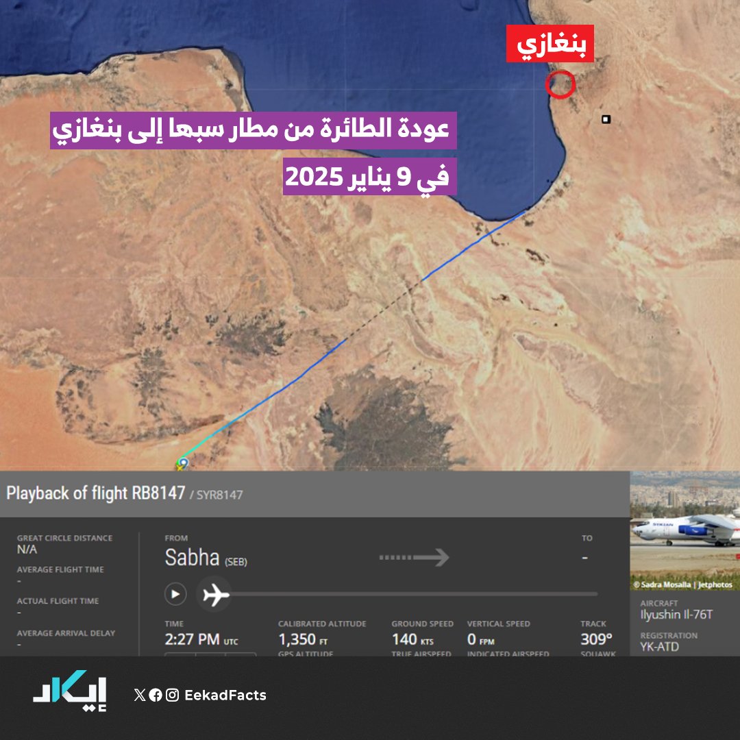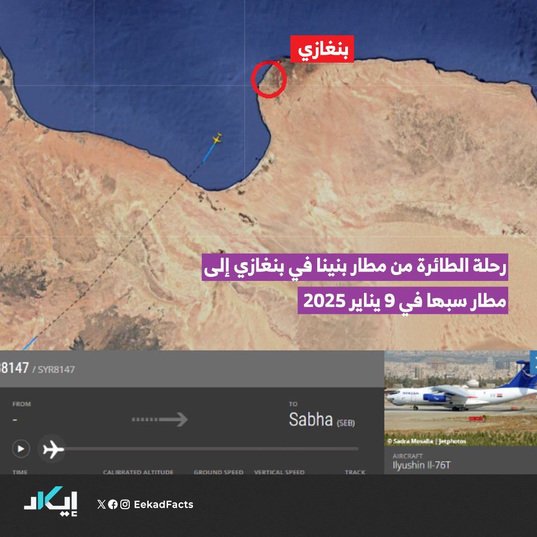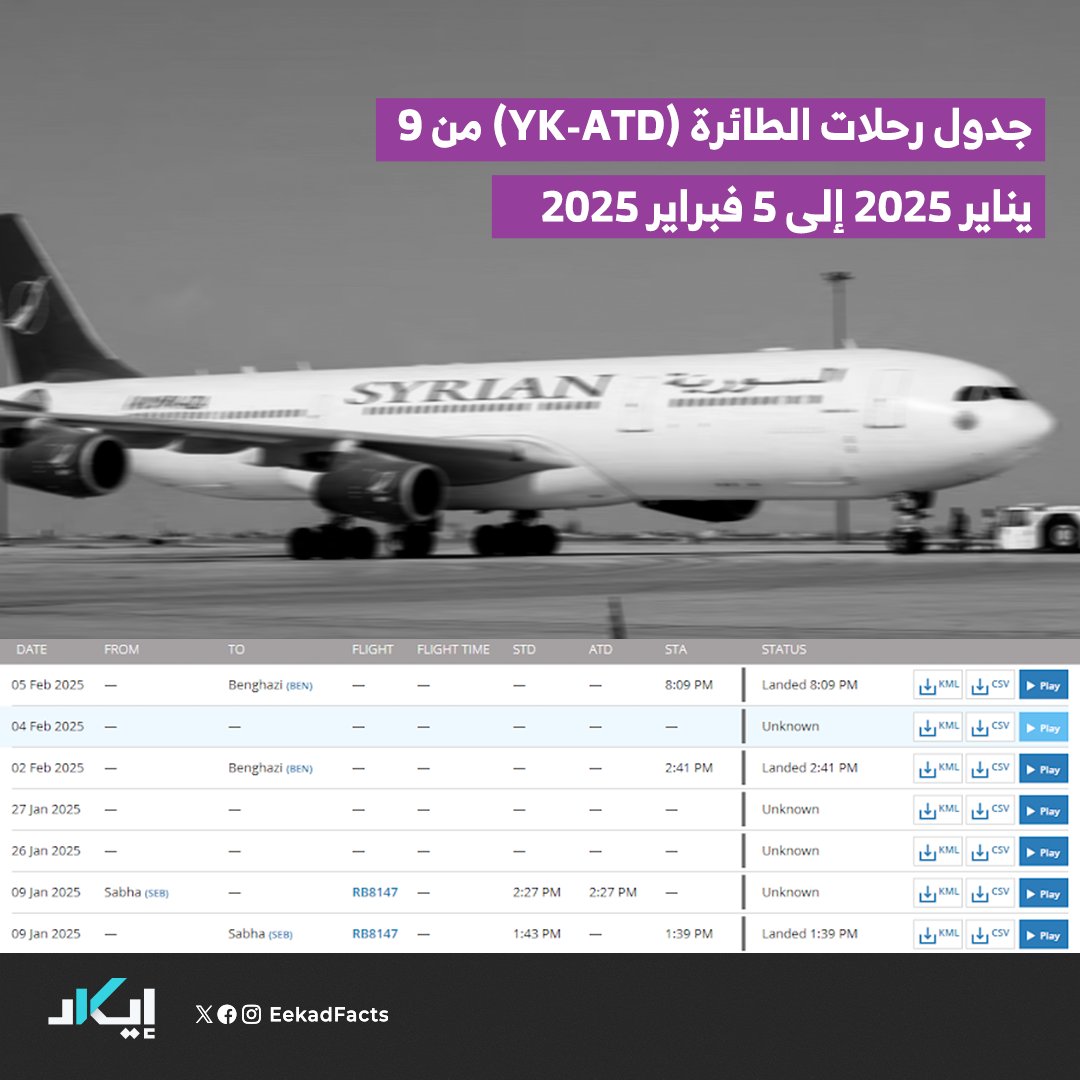 🔻فريق إيكاد تتبع الطائرة الأولى التي تحمل الرقم التسجيلي “YK-ATD”، التي دارت الأخبار حولها بأنها حملت قياديين في نظام بشار الأسد المخلوع، ورجال أمن إلى بنغازي، حيث يسيطر اللواء المتقاعد خليفة حفتر.