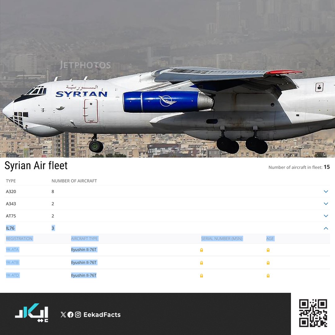 ⬅️تمتلك الخطوط الجوية السورية 3 طائرات شحن من طراز “إليوشن 76” وأرقامها التسجيلية: “YK-ATD” و”YK-ATA” و”YK-ATB”.