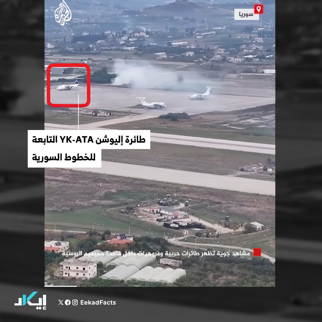 🔻في 30 ديسمبر 2024 نشرت شبكة الجزيرة فيديو لقاعدة حميميم الروسية، وكشف حينها عن وجود الطائرة “YK-ATA” داخل القاعدة بالفعل.