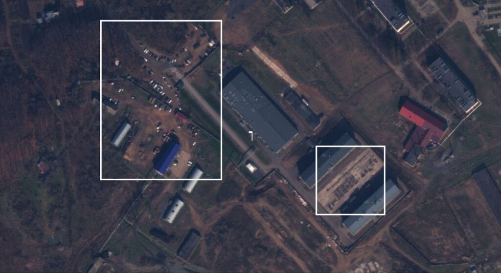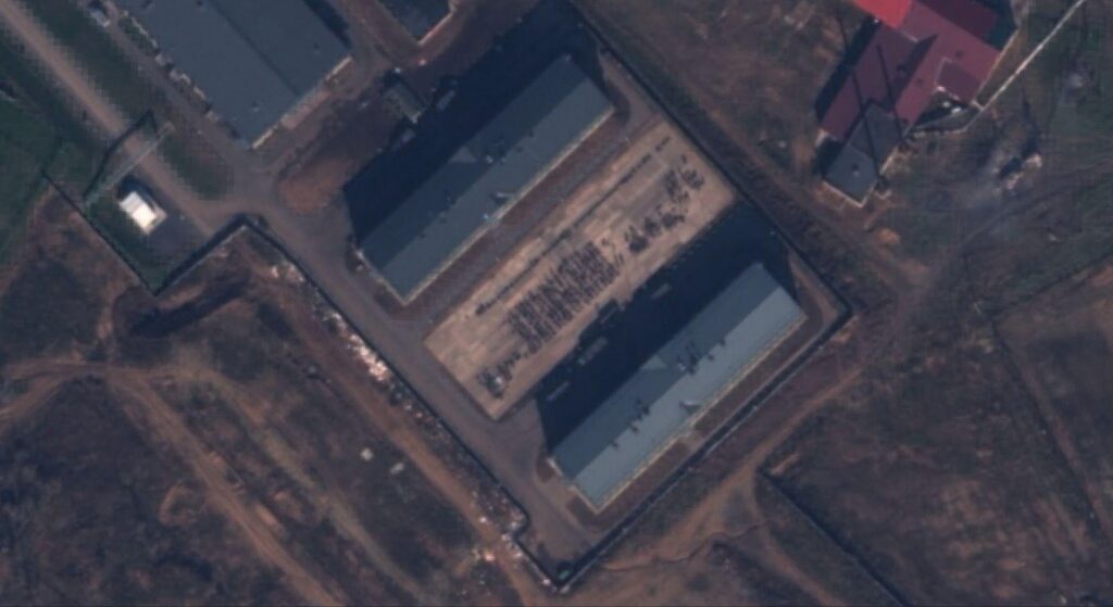 وبفحص وتحليل الصور، وجدنا عند ذات المباني التي حددنا تواجد الجنود “الشمال كوريين” عند موقعها الجغرافي بناء على المقطع المصور، حشود عسكرية كبيرة من مئات الجنود، حسب ما يبدو من خلال الصفوف المنظمة، وفي الجهة المقابلة، تظهر العديد من المركبات، والتي تعكس نشاط عسكري كبير في الثكنة الروسية.