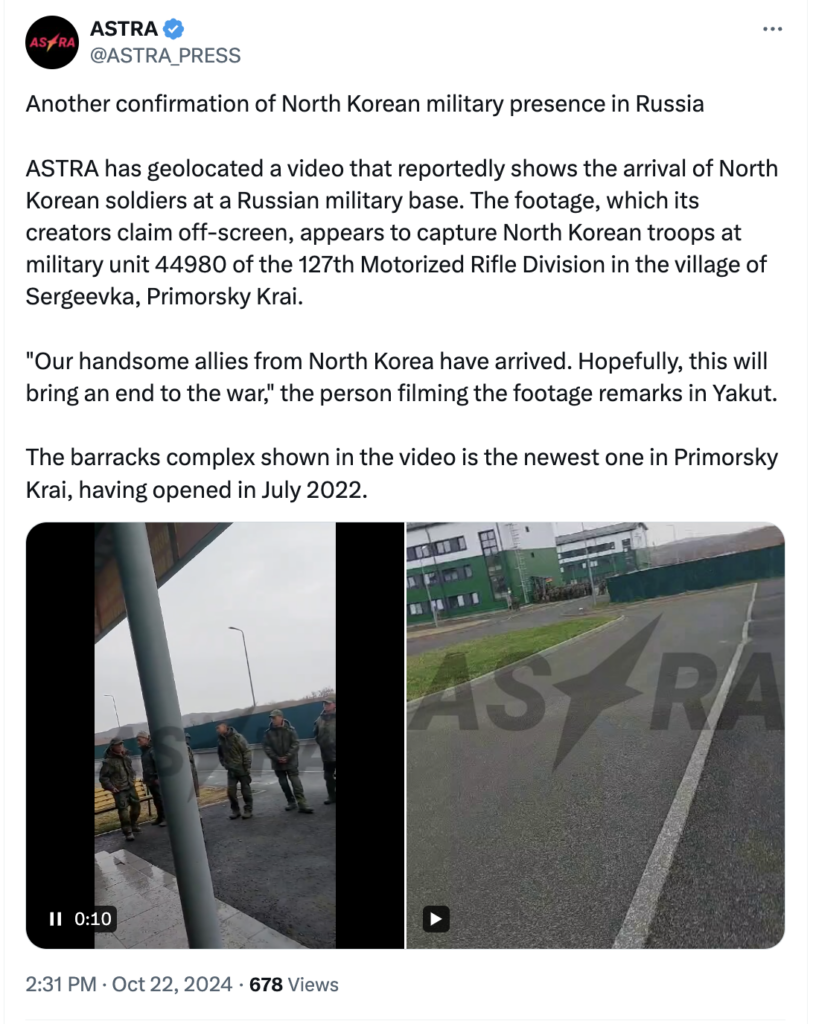 ففي يوم 22 أكتوبر 2024، نشرت وكالة “أسترا” الروسية المعارضة مقاطع مصورة لما قالت عنه “عشرات الجنود من كوريا الشمالية في ساحة تدريب عسكرية في في ” سيرجيفكا “، وهي مدينة ساحلية في أقصى الجنوب الروسي، تقع بالقرب من الحدود مع كوريا الشمالية.