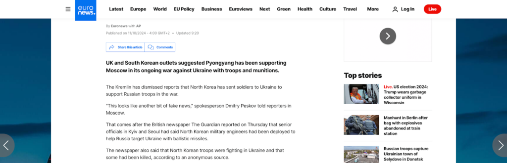 على الجانب الآخر، نفت روسيا استخدام قوات كورية شمالية في الحرب ضد أوكرانيا، فقد صرح المتحدث الرسمي باسم الكرملين “دميتري بيسكوف”، في مؤتمر صحفي عُقد بمنتصف شهر أكتوبر 2024، أن هذه الادعاءات هي “مجرد قطعة أخرى من الأخبار المزيفة”.