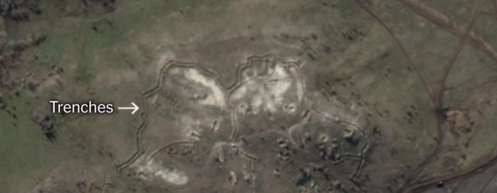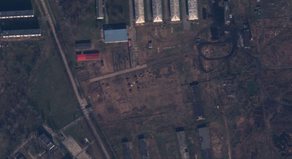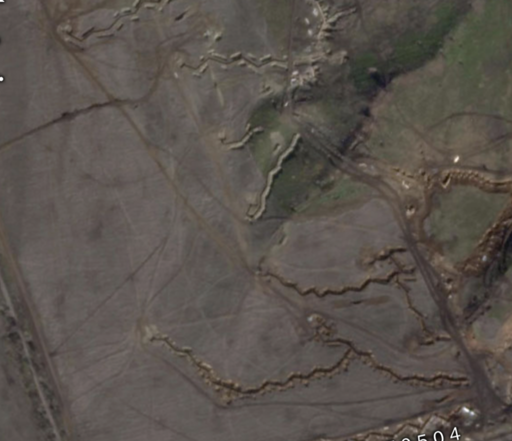 وفي أحد المساحات الفارغة بالثكنة العسكرية، عند النقطة التي لاحظنا بها آثار تجريف جديدة بصور Sentinel Hub، ظهرت منشآت وخنادق خاصة رجحنا ارتباطها بتدريب الجنود؛ حيث يشبه نمط هذه الخنادق، نمط الخنادق التي قامت القوات الروسية بحفرها بجبهاتها القتالية بأوكرانيا.