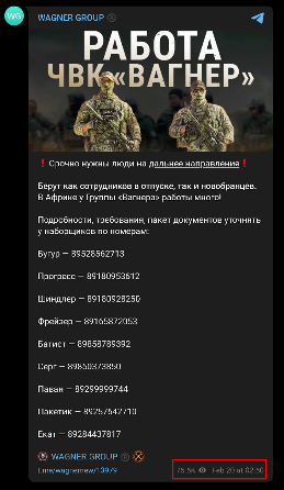 منشور التجنيد الذي أطلقته القناة الرسمية لمجموعة فاغنر على التلغرام في 20 فبراير 2024
