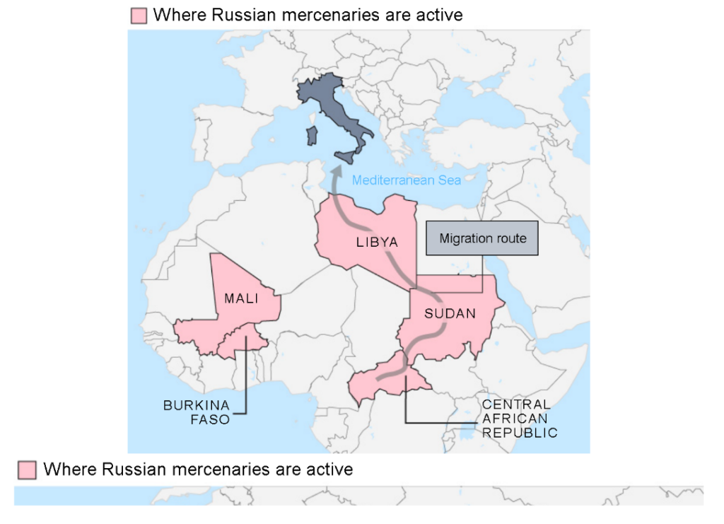 فضلًا عن السيطرة على تدفقات الهجرة في البحر المتوسط، الأمر الذي يصب في صالح العقيدة الروسية ويُكسبها ورقة ضغط على أوروبا، وهو الامر الذي أكدته صحيفة التلغراف البريطانية، عندما كشفت عن خطة روسية لإنشاء قوة “حرس حدود” قوامها 15000 جندي للسيطرة على طرق المهاجرين من إفريقيا إلى أوروبا، وهو ما يمنحها ورقة ضغط على الدول الأوروبية.