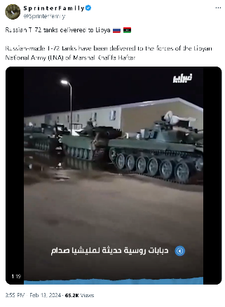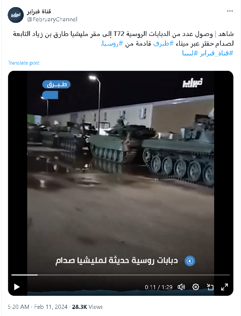 في الثلث الأول من فبراير 2024 وصلت أولى الشحنات العسكرية لميناء طبرق، وقد تضمنت عشرات الدبابات الروسية من طراز T-72 كما بيّن مقطع مصور نشرته قناة فبراير الفضائية الليبية في 11 فبراير وتناقلته حسابات باحثين في استخبارات المصادر المفتوحة، حيث ظهرت الدبابات بالمقطع المصور داخل أحد المقار العسكرية، دون أن تتم الإشارة إلى تاريخ وصول الشحنة إلى طبرق.