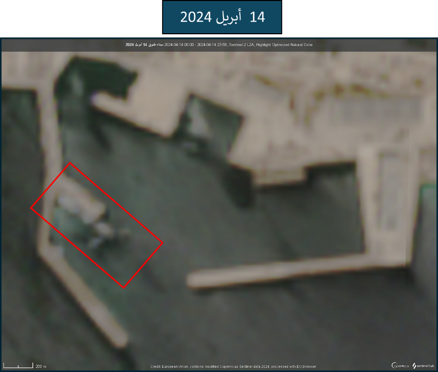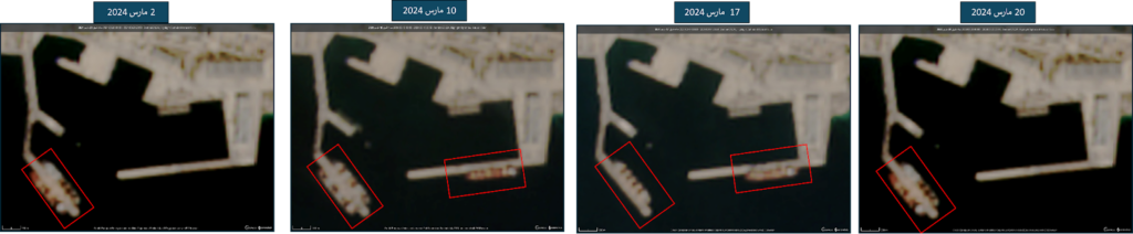 إلا أن تلك الشحنات العسكرية التي توالت بشهر أبريل ثم يونيو، قد سبقها شحنات عسكرية أخرى كشف عنها مصدر ليبي نقلت عنه وكالة نوفا الإيطالية، وتحققت منه “إيكاد” عبر صور الأقمار الصناعية الخاصة بالقاعدة، حيث كشفت صور الأقمار الصناعية عن حركة نشطة للسفن شهدها الميناء في شهر مارس2024.