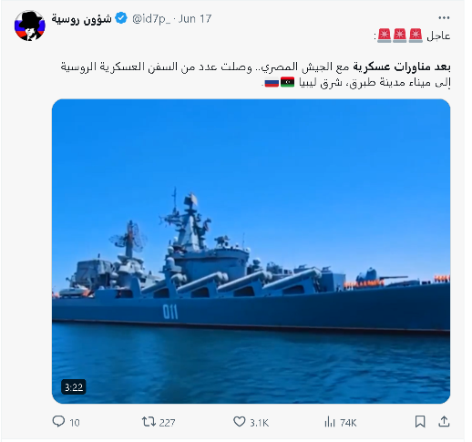 في هذا الإطار، كشفت وسائل إعلام غربية عن وصول أكثر من 6000 طن من المعدات والتجهيزات العسكرية إلى ليبيا، جاء غالبها عبر ميناء طبرق العسكري من خلال سفن إنزال عسكرية روسية انطلقت من طرطوس ومن روسيا (15)، وقد تزامنت أخبار وصول الشحنات العسكرية مع تداول وسائل إعلام ليبية ونشطاء ليبيون صور ومقاطع مصورة تظهر عمليات إنزال ونقل تلك الشحنات العسكرية في الميناء.