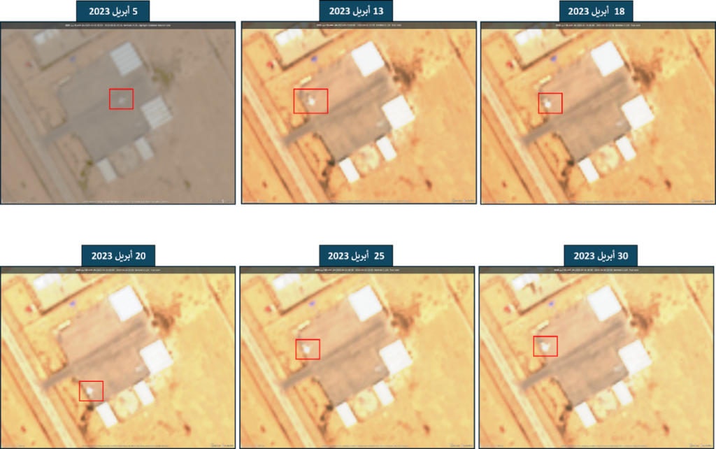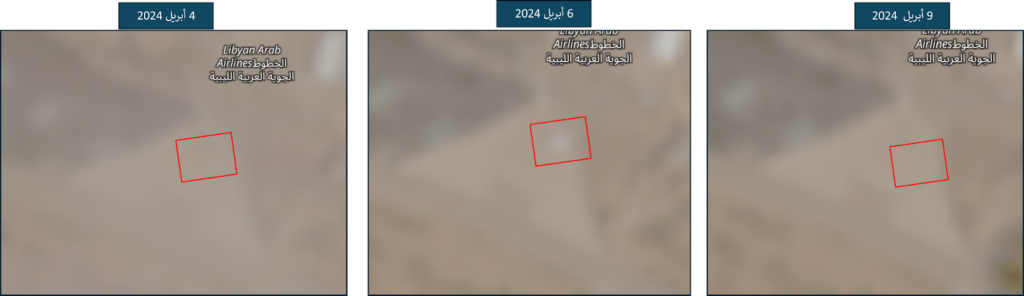 بالإضافة إلى قربها الجغرافي من ميناء طبرق حيث تبلغ المسافة بينهما 23.5 كم فقط، ووجود عناصر “فاغنر” داخلها، فإن ما عزز انطلاق الشحنات العسكرية الروسية جوا من قاعدة “جمال عبد الناصر” الجوية إلى قواعد أخرى، هو ما رصده فريق “إيكاد” عبر صور الأقمار الصناعية في تلك الفترة، حيث كشفت الصور عن هبوط طائرة على المصفّ الرئيسي للقاعدة ما بين الخامس والسادس من أبريل، ثم اختفت في التاسع من أبريل، أي بعد يوم واحد من وصول الشحنات العسكرية إلى ميناء طبرق، وهو ما يزيد من احتمالية كون تلك الطائرة مخصصة للشحن العسكري، وأنها انطلقت نحو مطار “القرضابية”.
