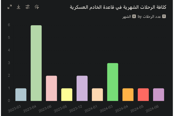 منحنى بياني يظهر كثافة رحلات الطائرة إلى قاعدة الخادم العسكرية في الفترة بين مارس 2023 ويونيو 2024