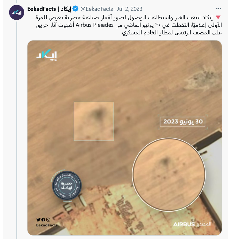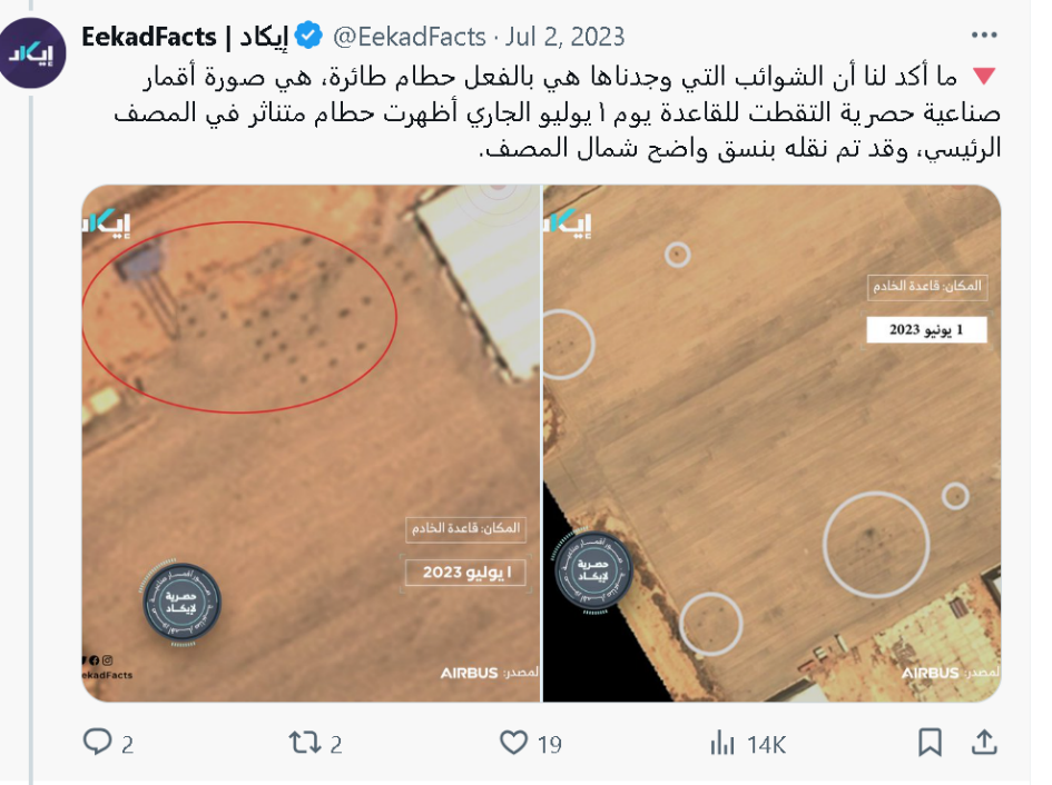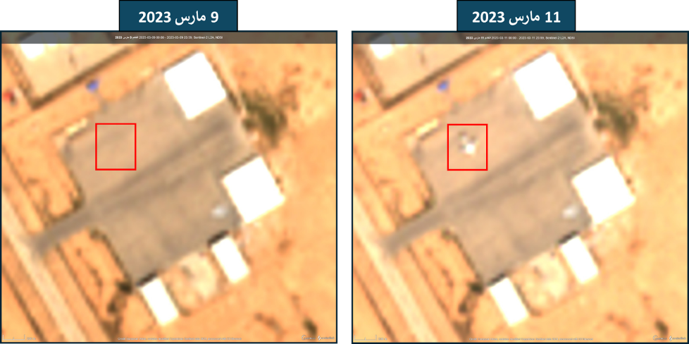 فقد رصد فريق “إيكاد” عبر صور الأقمار الصناعية يوم 11 مارس 2023، طائرة في ساحة المهبط الشرقي لقاعدة الخادم لم تكن موجودة من قبل بحسب ما أثبتته صور الأقمار، وبقياس أبعاد الطائرة رجّح فريق إيكاد أنها من طراز IL 76 المتخصصة بنقل المعدات العسكرية. ثم غادرت القاعدة خلال أقل يومين، فلم تظهر في الصور المُلتقطة للقاعدة بتاريخ 14 مارس 2023.