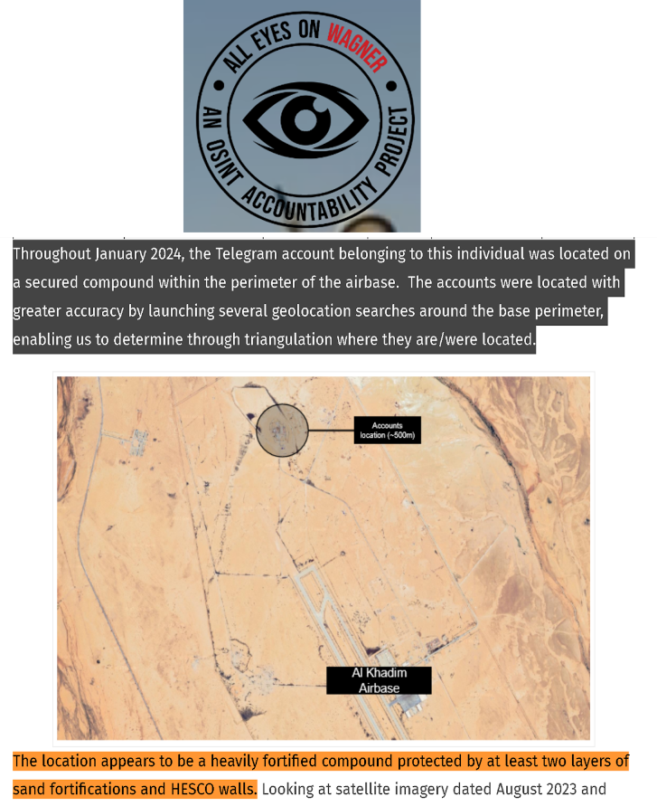 الأمر الذي يتفق وما وثقه مصدر مستقل عن وجود مُجندين روس متطوعين داخل قاعدة الخادم في 17 مارس، أحدهم اسمه “أندريه”، وقد بقي في القاعدة خلال إبريل قبل أن يتم رصده أوائل مايو 2023 في قاعدة الجفرة العسكرية الواقعة وسط ليبيا، بحسب ما كشفه باحثو OSINT في منظمة All Eyes on Wagner.