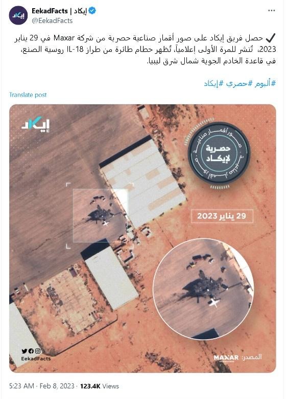 التحليل الذي أكدته منصةAll Eyes on Wagner المتخصصة برصد وتتبع أنشطة شركة “فاغنر” الأمنية حول العالم، حيث رصدوا في تقرير سابق تحليق طائرة من طراز IL76D تابعة لمجموعة “فاغنر” من قاعدة “حميميم” في سوريا إلى قاعدة الخادم في ليبيا في 13 أبريل 2023.