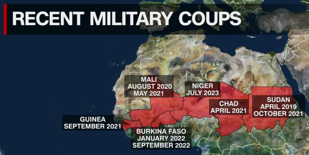 ففي إثر الانقلابات التي وقعت في كلا من: مالي عام 2020، وبوركينا فاسو عام 2022 والنيجر عام 2023. أعلن “تحالف دول الساحل” الذي يضم كلا من مالي وبوركينا فاسو والنيجر الانسحاب من المجموعة الاقتصادية لدول غرب أفريقيا “إيكواس” التي تضم 15 عضوا من بلدان غرب أفريقيا. بعد أن كانت هذه الدول قد انسحبت -سابقا- من مجموعة دول الساحل الخمس التي تأسست عام 2014 برعاية فرنسية وأوروبية بهدف محاربة “الإرهاب” في الساحل، رغم أن الحركات المسلحة في منطقة الساحل جنوب الصحراء قد تضاعفت منذ 2017 إلى 7 أضعاف.
