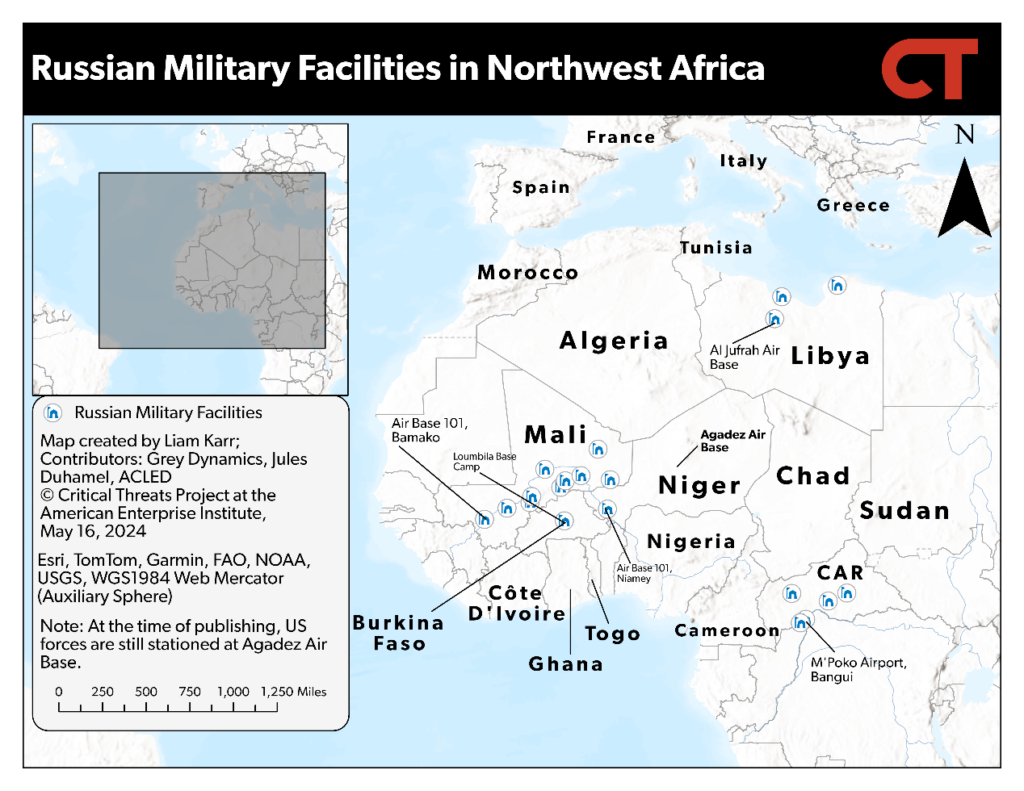 في مقابل هذا الانسحاب الغربي، تنامت الأنشطة العسكرية الروسية في إفريقيا واتسع نطاقها بشكل تدريجي. فبجانب الوجود العسكري الروسي في ليبيا منذ عام 2016، قدمت القوات الروسية المساعدة العسكرية في بوركينا فاسو ومالي. وفى النيجر، ظهرت مؤشرات عديدة للتعاون العسكري مع روسيا، كما زار رئيس تشاد موسكو في مطلع عام 2024، ونشرت روسيا قوات وقدمت مساعدات أمنية وعسكرية في المنطقة الممتدة من السنغال وحتى البحر الأحمر.