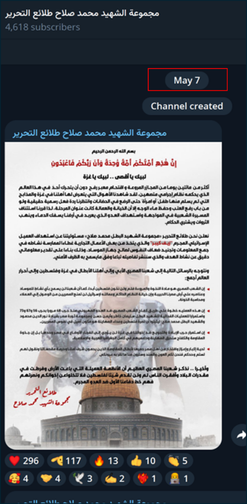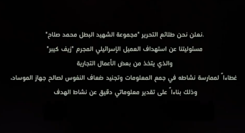 انتشر الخبر _في البداية_ يوم 7 مايو، على مجموعة أنشأتها حسابات مجهولة على منصة “تلغرام”، حملت اسم “مجموعة الشهيد محمد صلاح طلائع التحرير”، التي نشرت بيانًا أشارت فيه إلى مسؤوليتها عن قتل رجل الأعمال الإسرائيلي “زيف كيبر”، ووصفته بأنه “عميل إسرائيلي” يحمل الجنسية الكندية ويقوم بجمع المعلومات وتجنيد العملاء لصالح الموساد الإسرائيلي.