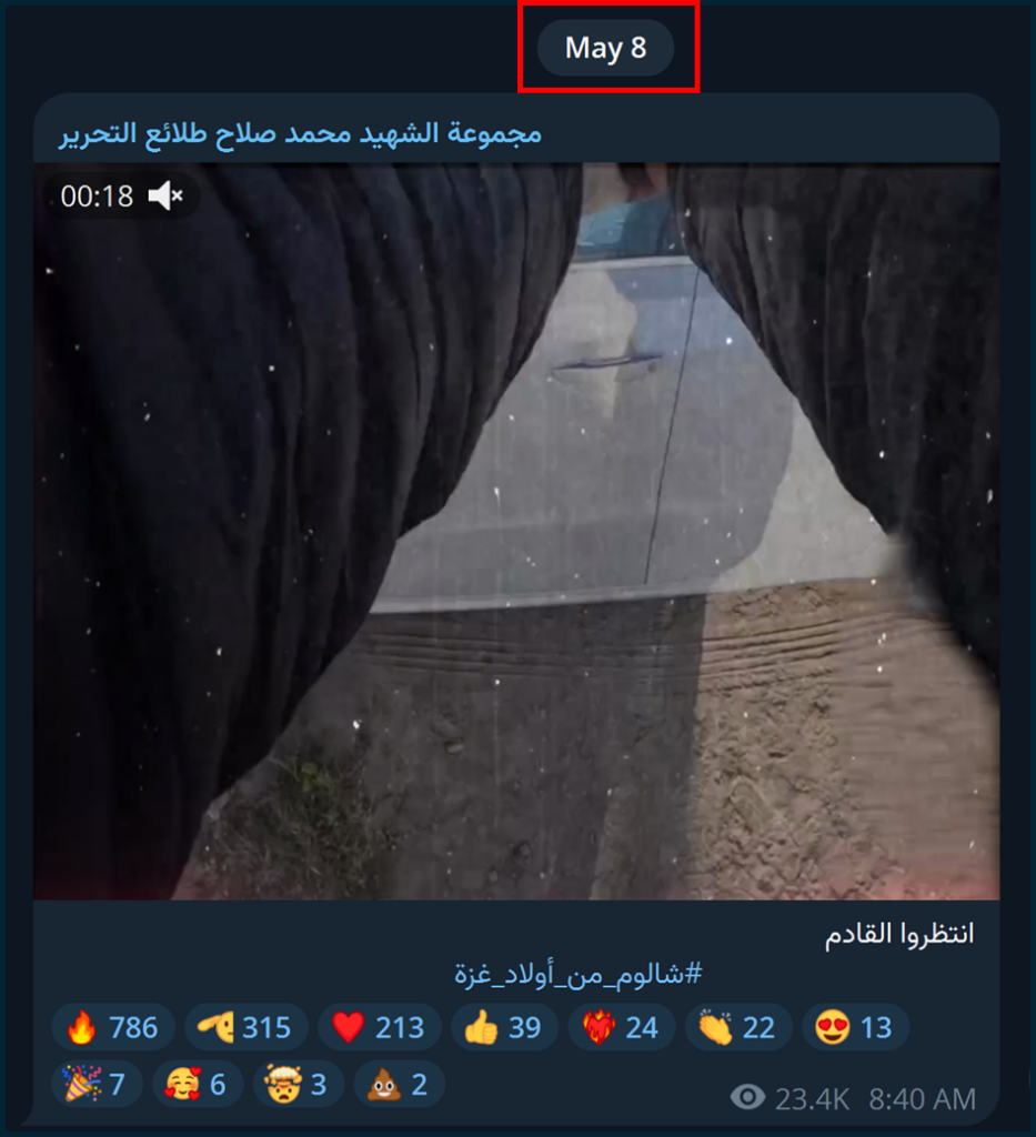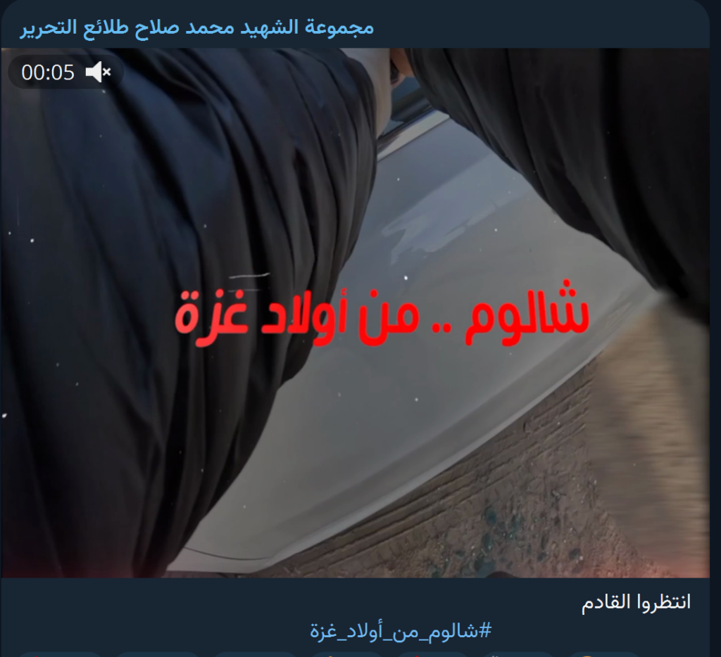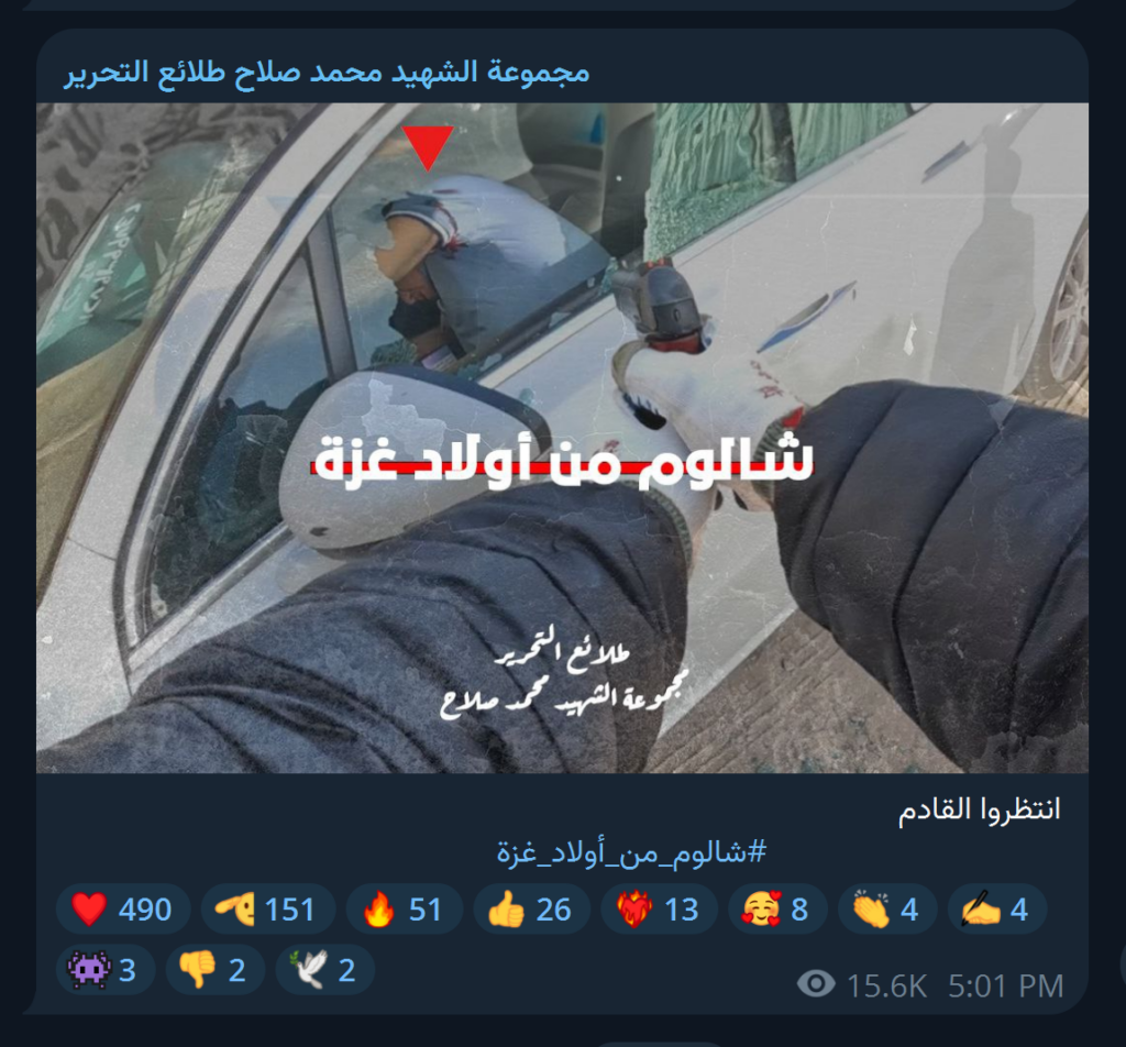 وفي اليوم التالي لتنفيذ العملية، بثّت المجموعة مقطع ا مصورا لعملية الاغتيال بلغت مدته 19 ثانية وانتشر على نطاق واسع خلال ساعات. وقد ظهر في المقطع شخص مجهول يتقدم نحو سيارة تقف على طرف الطريق، ثم أطلق الرصاص على سائقها قائلا: “شالوم من أبناء غزة”، ليتركه ميتا داخل سيارته.