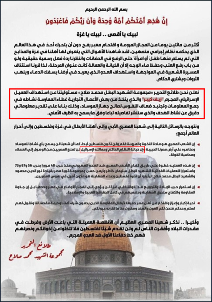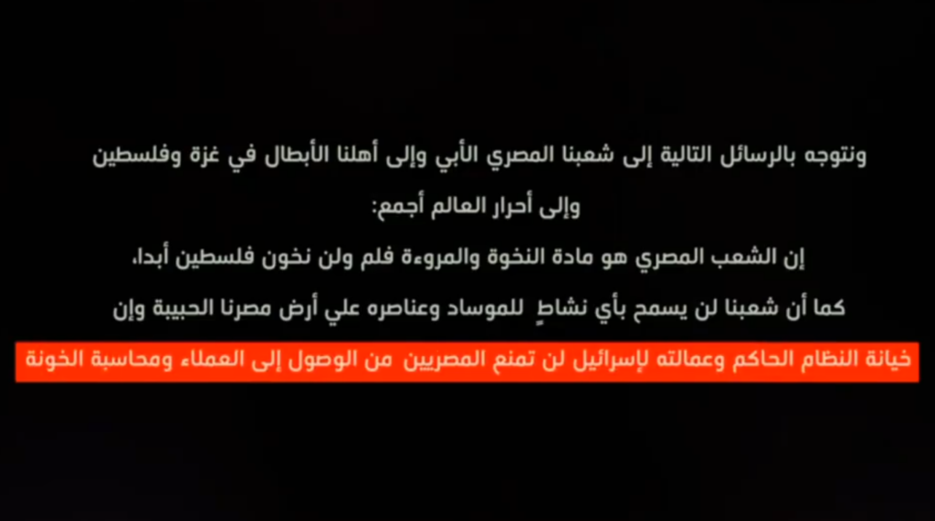 وقد أشار البيان الذي شاركته المجموعة على قناة “تلغرام” أن العملية جاءت ردًا على المجازر الإسرائيلية بغزة وعلى عمالة النظام السياسي المصري لصالح إسرائيل، وأن العملية تمّت بعد الرصد والتحري الدقيق للهدف، والذي أثبت صلة القتيل بالموساد الإسرائيلي.