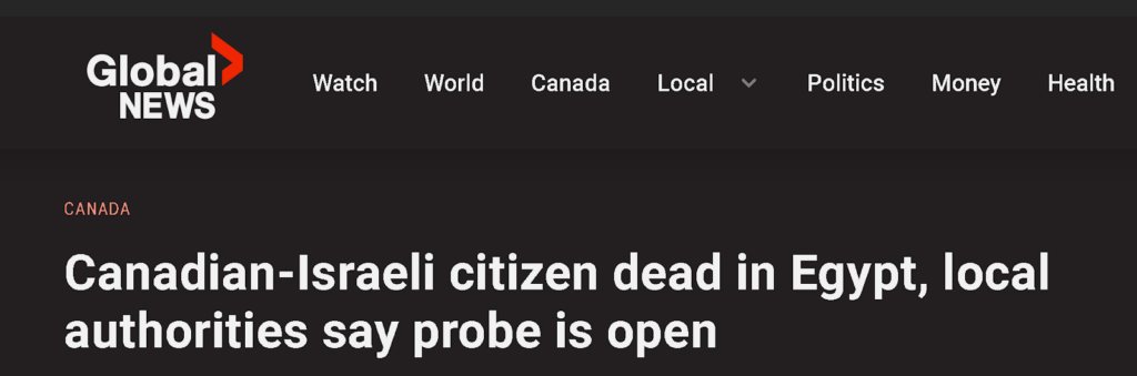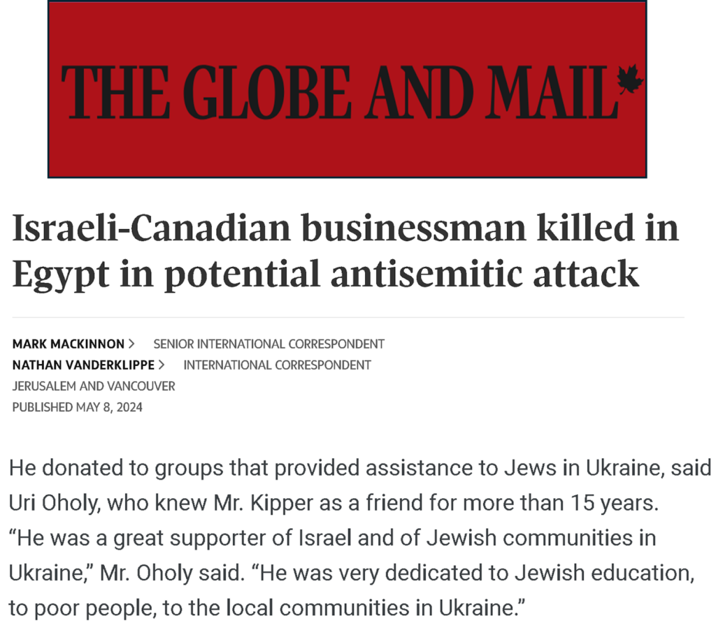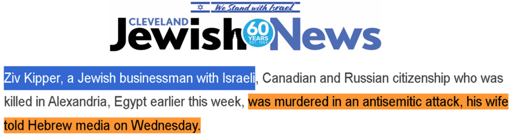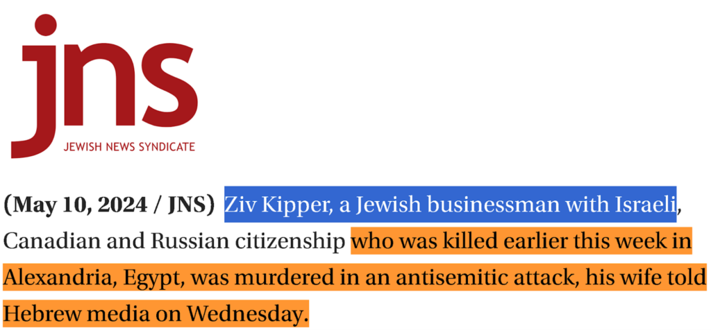 في الثامن من مايو 2024 تداولت حسابات على الانترنت خبر مقتل رجل الأعمال الإسرائيلي Ziv Kipper الحامل للجنسيتين الأوكرانية والكندية في مدينة الاسكندرية بمصر.
