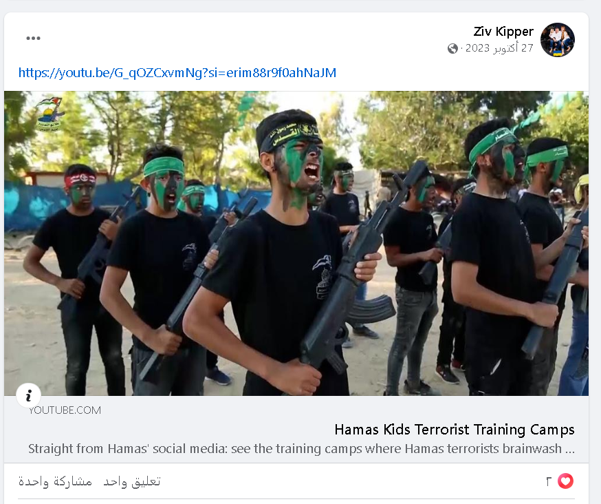 وبتاريخ 27 أكتوبر شارك Kipper مقطع مصور آخر بثّه إعلام الجيش الإسرائيلي بعنوان “Hamas Kids Terrorist Training Camps”، أي “مخيمات تدريب أطفال حماس الإرهابيين”، كنوع من التبرير لذبحهم!