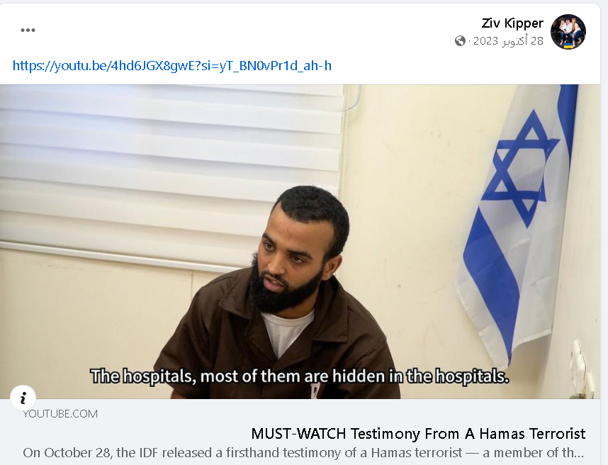 ثم في 28 أكتوبر 2023 شارك Kipper على صفحته على منصة التواصل “فيسبوك” جزءا من مقابلة أجراها الإعلام العسكري لجيش الدفاع الإسرائيلي مع أسرى فلسطينيين اعتقلهم الجيش الإسرائيلي في غزة كان عنوانها The hospitals, most of them are hidden in the hospitals” ” وتضمنت اعترافات مدنيين فلسطينيين قالوا بأنهم من قيادات حماس، وبأن مخازن الأسلحة والمئات من قادة ومقاتلي المقاومة الفلسطينية يختبئون داخل مشافي غزة وخاصة مشفى الشفاء. غير أن جميع الفلسطينين في المقابلات كانوا مدنيين سبق أن اعتقلتهم قوات الاحتلال الصهيوني في غزة وتعرضوا لأقسى انواع التعذيب.