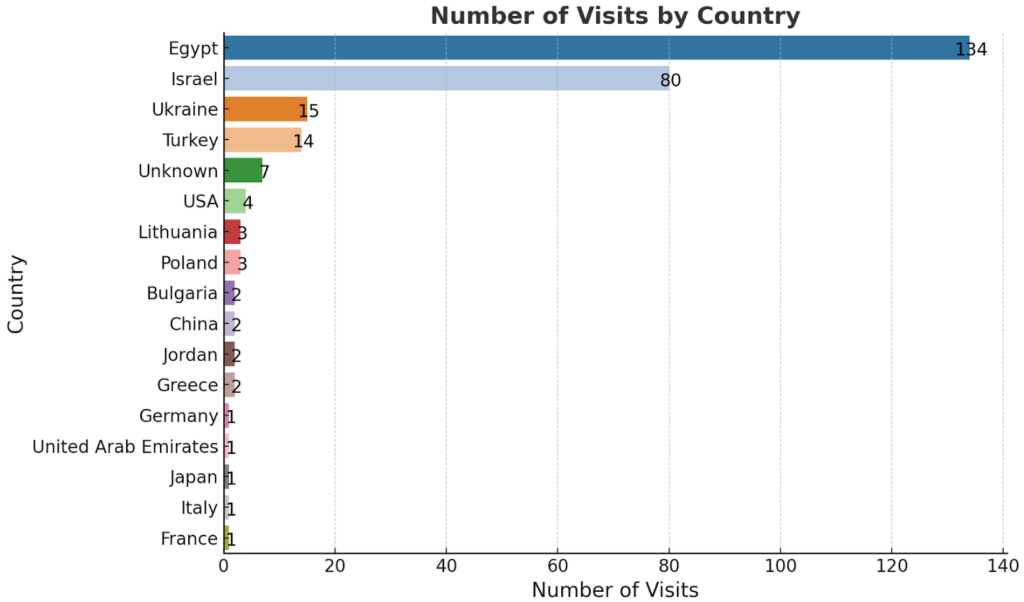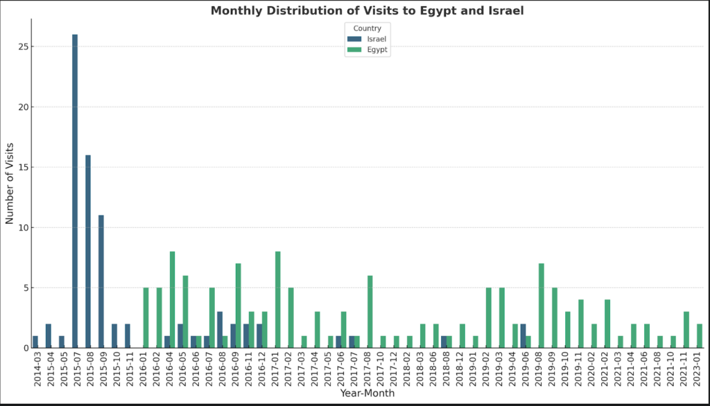 كما أظهر التحليل الرقمي للرحلات أن الفترة الممتدة بين مارس 2014 ونوفمبر 2025 قد شهدت أكبر عدد من الزيارات وأكبر قدر من التحركات له داخل إسرائيل بدون أي . إضافة لما سبق أظهر التحليل أن أول زيارة موثقة له في فيس بوك إلى مصر بدأت يناير 2016 وأنه تنقل عدة مرات بين مصر وإسرائيل في الفترة الممتدة بين يناير 2016 وديسمبر 2016 حيث استقر في مصر بعدها، وتعتبر هذه الفترة هي الأنشط في تنقلاته بين مصر وإسرائيل منذ دخوله إلى مصر وحتى تاريخ آخر زيارة موثقة في حسابه على فيس بوك.