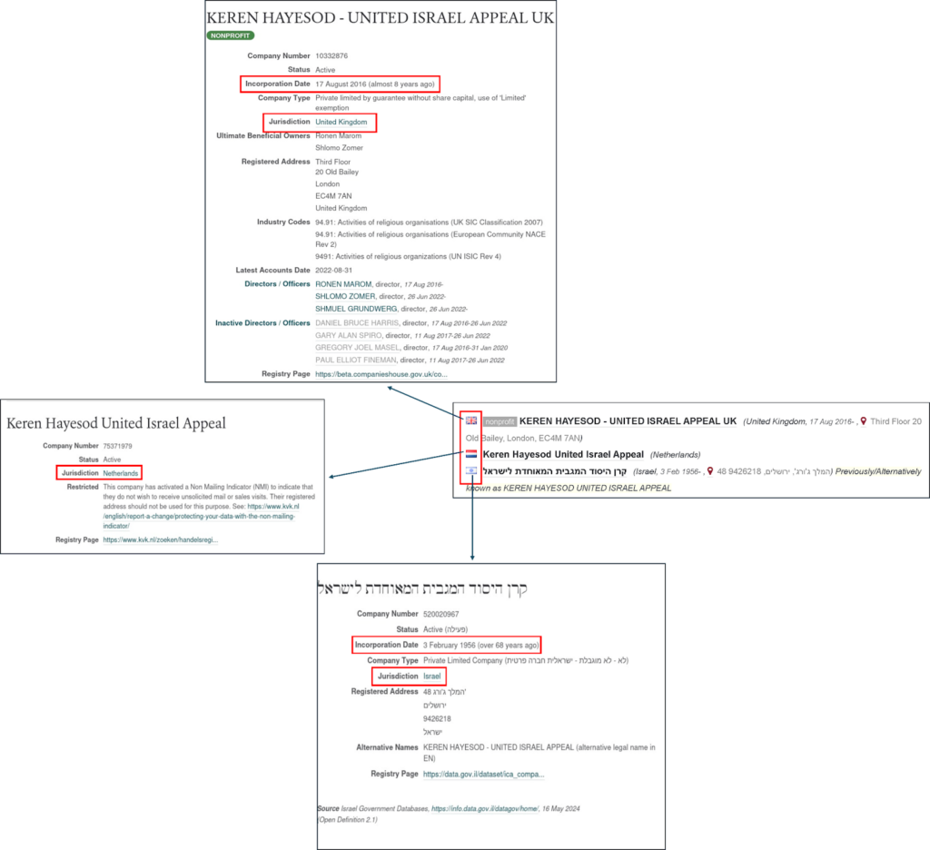 البحثُ المعمق الذي أجريناه على المنظمة والذي تضمن مراجعة وتتبع وثائق تسجيلها وأنشطتها وتصريحات أعضائها باستخدام أدوات مفتوحة المصدر بجانب موقعها الرسمي والبحث اليدوي على الانترنت، قادنا إلى أن مؤسسة Keren مسجلة وتتمتع بقانون الحماية في ثلاثة دول (هي بريطانيا ونيوزلندا وإسرائيل)، فهي مؤسسة مسجلة في إسرائيل في فبراير 1956، و مسؤولة بشكل رئيسي عن جمع التبرعات لصالح إسرائيل في أكثر من 45 دولة، عبر أكثر من 57 حملة، تقدم من خلالها دعمًا كبيرًا لإسرائيل في أكثر من مجال عبر برامج ومشاريع تمويل متخصصة.