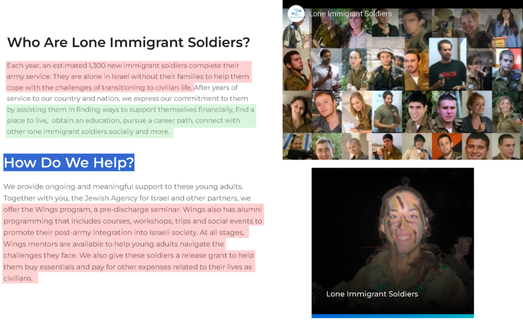 أحد أهم هذه المشاريع المرتبطة بالجيش الإسرائيلي، هو مشروع Lone Immigrants Soldiers أو “الجنود المهاجرون الوحيدون”، ويهدف هذا المشروع إلى دعم جنود الجيش الإسرائيليين الشباب الحاملين لجنسيات أخرى ممن انتقلوا إلى إسرائيل في سن الخدمة العسكرية عبر برامج الهجرة اليهودية وبقيت عوائلهم في البلدان الأصلية، ويشتمل الدعم المقدم على توفير فرص عمل لهم، وتقديم منح مالية لمساعدتهم على الاندماج والاستقرار في إسرائيل.