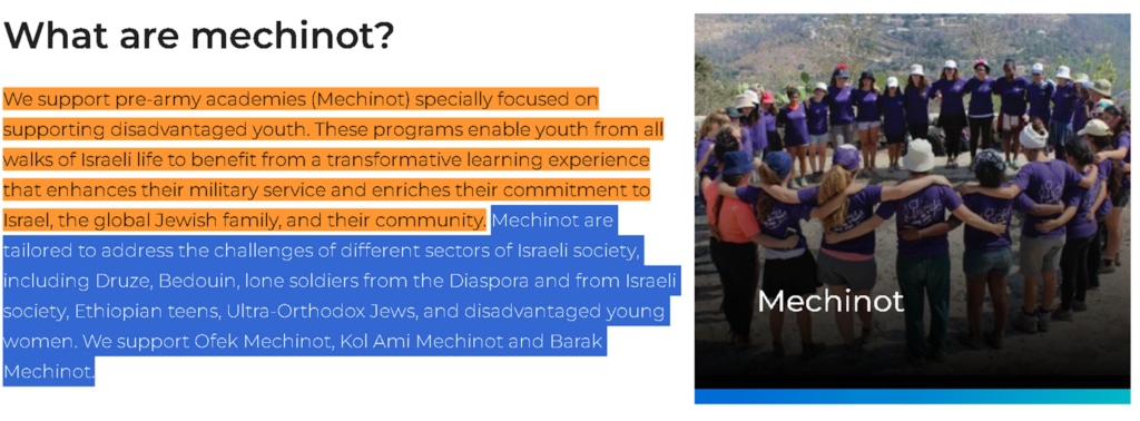 وهناك أيضا مشروع Mechinot أو أكاديمية القيادة قبل العسكرية، و يهدف هذا المشروع إلى إعداد وتأهيل الشباب من الفئات المحرومة أو المُصنفة بكونها عرضة للخطر داخل إسرائيل مثل (الدروز والبدو والجنود المهاجرين الوحيدين والمراهقين الأثيوبيين واليهود الأرثوذكس). ويشتمل التأهيل على تقديم دورات تعليمية تحضيرية لتعميق التزامهم تجاه المجتمع اليهودي والدفاع عن إسرائيل وتجهيزهم للخدمة العسكرية والأدوار القيادية المستقبلية.