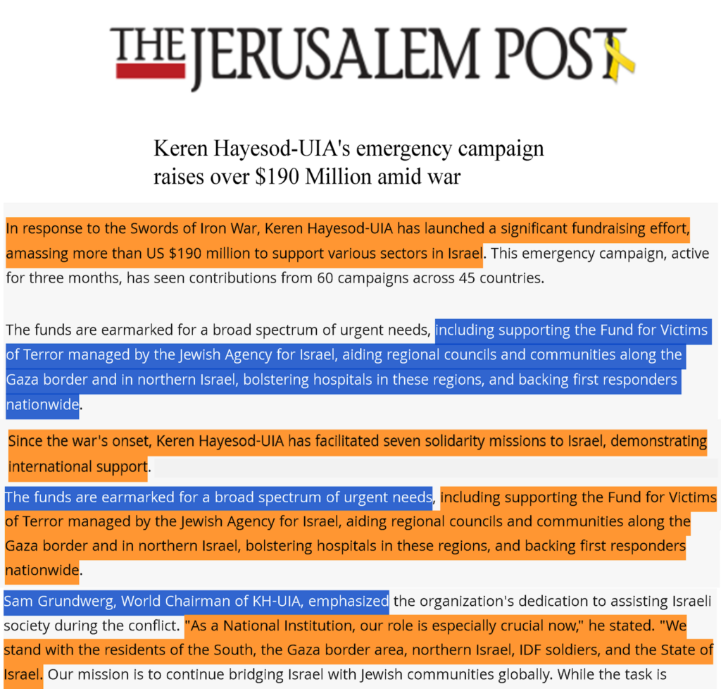 لذلك، ومنذ بدء معركة “طوفان الأقصى” في السابع من أكتوبر 2023 وحتى منتصف يناير 2024، قدمت المنظمة أكثر من 190 مليون دولار لإسرائيل ضمن سبع حملات طارئة هدفت لدعم الحكومة والجيش الإسرائيلي بحسب ما كشفته صحيفة The Jerusalim Post الإسرائيلية. (10)