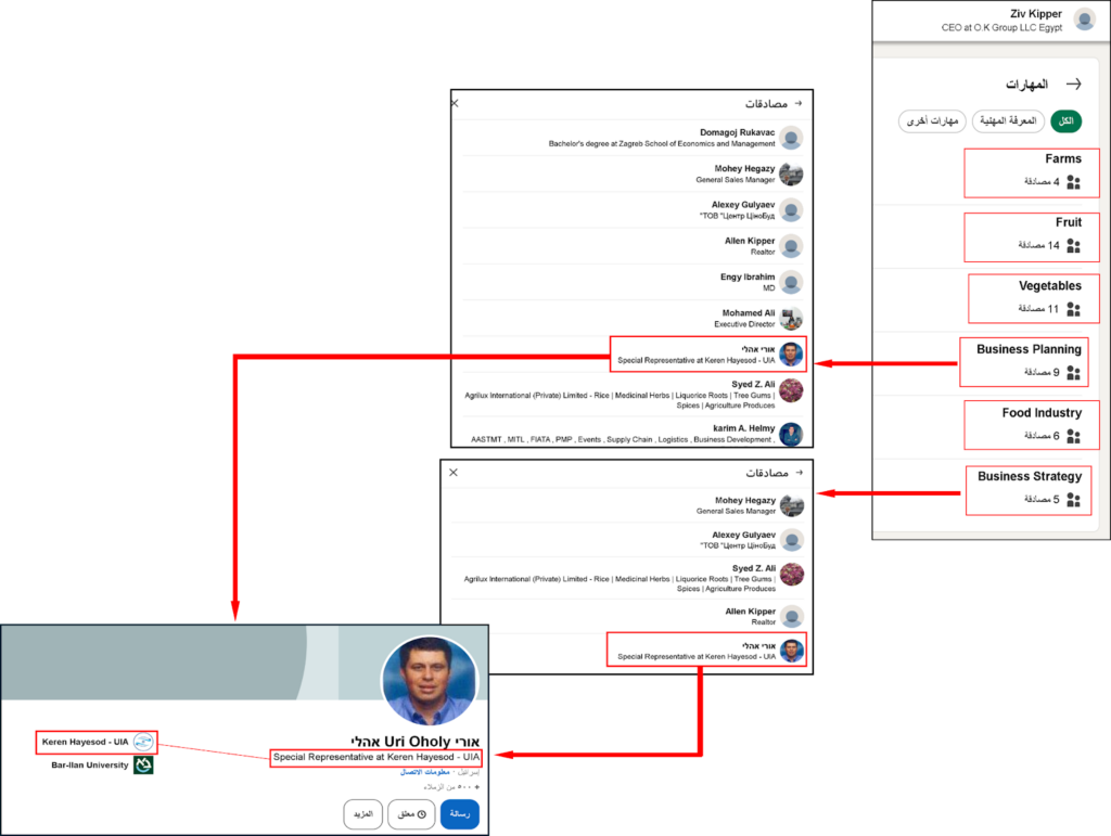 أما الغرض من تلك الرحلات المتكررة، فقد كشفه أرشيف Kipper على موقع الأعمال “لينكدإن”، فمن خلال فحص أرشيف حساب ” كبير ” على موقع الأعمال “لينكدإن”، وجدنا علاقات تجمعه بشخصيات إسرائيلية أخرى قامت بالمصادقة على مهاراته الشخصية، أحد تلك الشخصيات الإسرائيلية يسمى אורי Uri Oholy אהלי الذي يُعرف نفسه على صفحته الشخصية على نفس الموقع بأنه “ممثل خاص لمؤسسة Keren Hayesod-UIA الخيرية، ويقيم في إسرائيل.