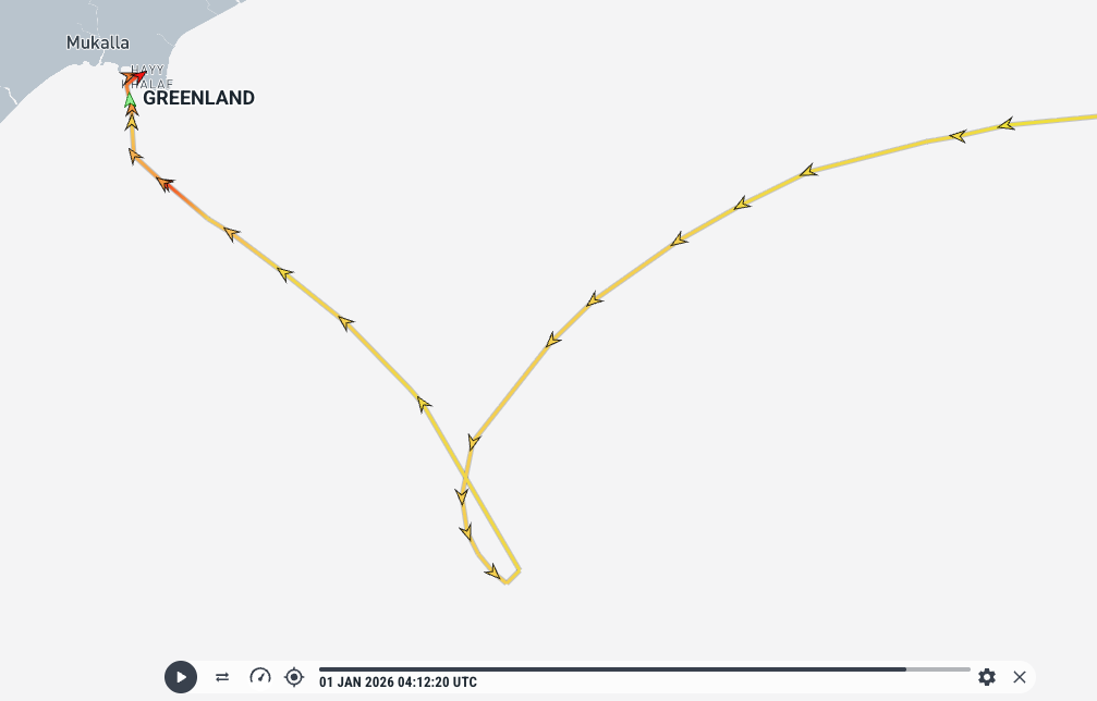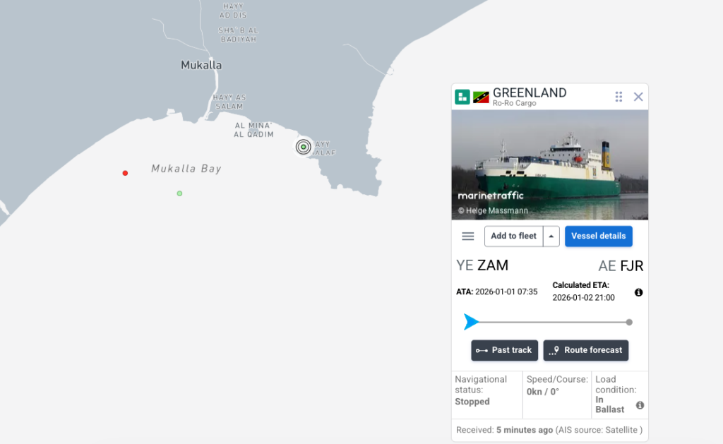 وحسب ما رصده الفريق من بيانات ملاحية، وضعت “جرينلاند” ميناء الفجيرة كوجهة تالية بعد المكلا، وهو ما قد يعزز الفرضية القائلة بأن العودة المفاجئة كانت تهدف إلى نقل عتاد عسكري أو أفراد من جنوب اليمن إلى الإمارات.