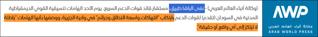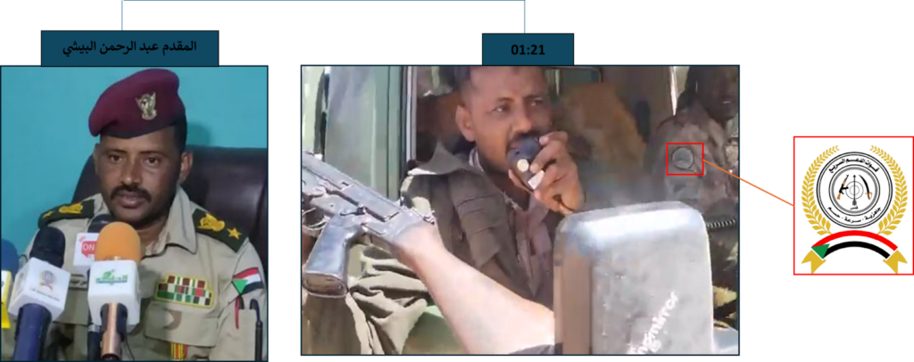 إحدى النقاط المهمة في المقطع تمثلت في صوت مصوره الذي تحدث عن قيادة “المقدم عبد الرحمن حميدة البيشي” للمجموعة العسكرية المشتبكة. وبالبحث، وجدنا أن البيشي يشغل منصب قائد قوات الدعم السريع في إقليم “النيل الأزرق”.