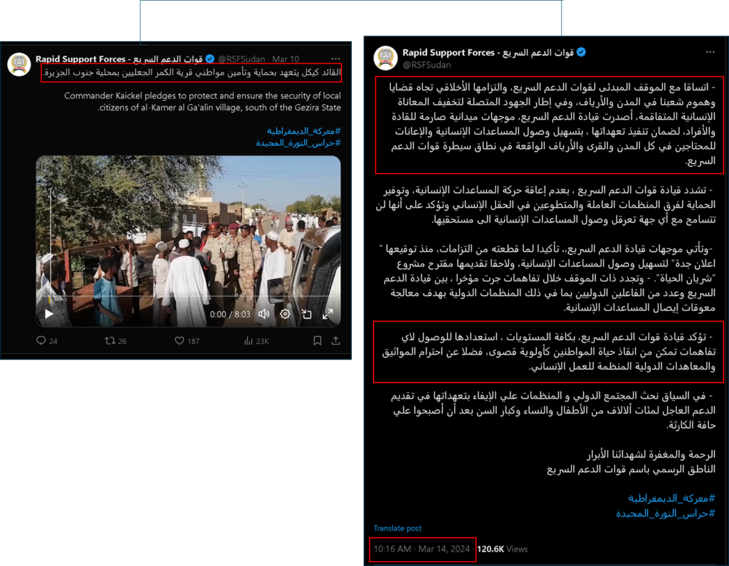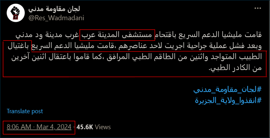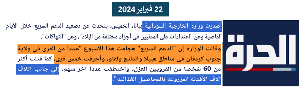 ومما سبق، ثبت أن قوات الدعم السريع باتت الجهة العسكرية المسيطرة على بلدة “المدينة عرب” بدءًا من 28 فبراير/ شباط 2024 (تاريخ انتشار الفيديو المشار إليه أعلاه). وباعتبار أن موعد السيطرة يتقاطع مع أنباء الانتهاكات التي تحدثت عن هذه الجرائم بعد توثيقنا لوصول الدعم السريع، فإن ذلك يعني مسؤولية ميليشيات حميدتي عن تلك الانتهاكات.