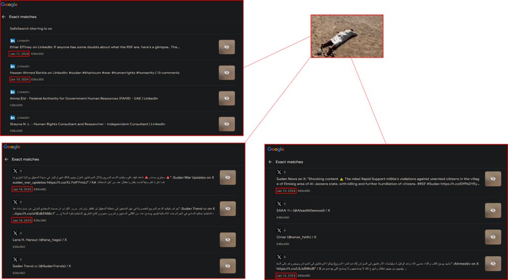 ومن ثم ظهر ذات الشخص في مقطع الفيديو وهو يوجه المقاتلين عبر جهاز اتصالات بيده مرتديًا الزي العسكري للدعم السريع، وبالبحث العكسي، واستدللنا على ذلك عبر البحث العكسي عن صورته.