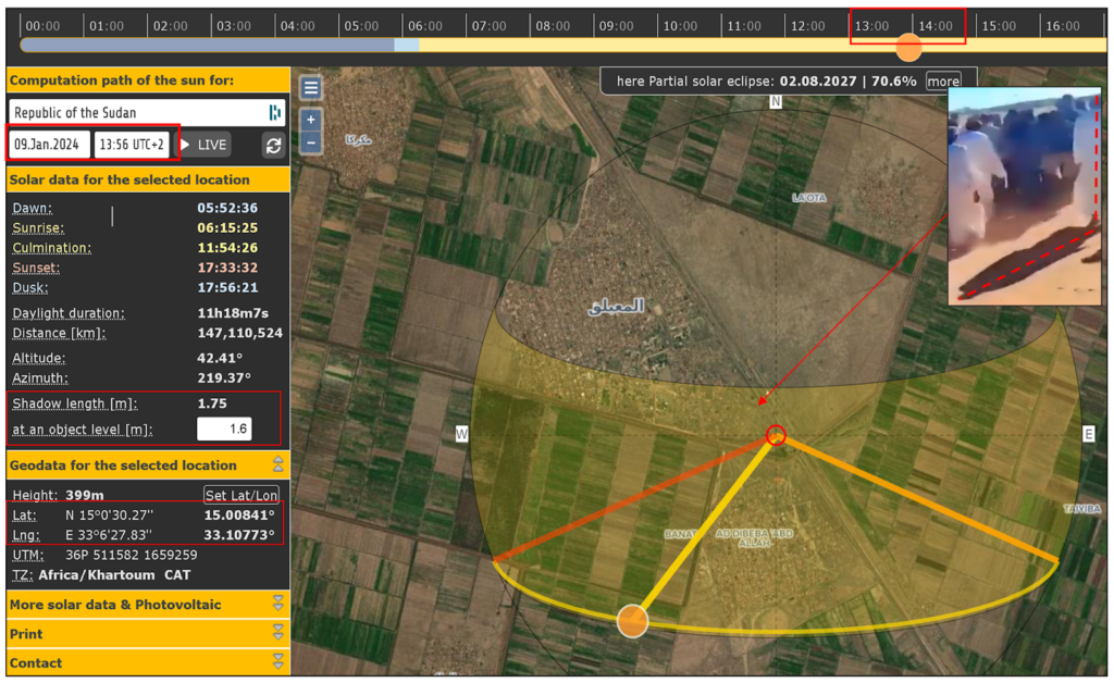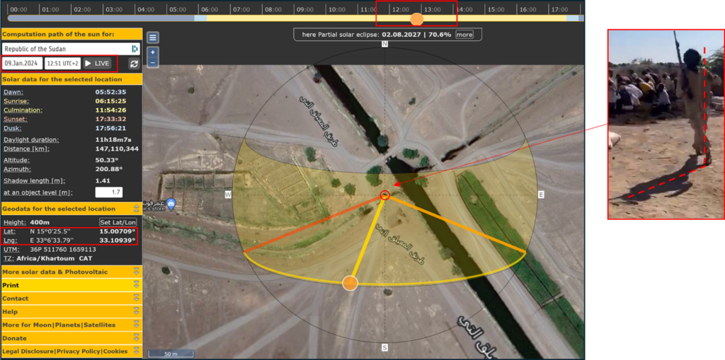 ولمعرفة توقيت تصوير الفيديو، اعتمد الفريق على تحليل الضوء والظلال المرئية من خلال ” SunCalc “، وقدّر أن المقطع صُور يوم 9 يناير/ كانون الثاني 2024، خلال فترة الظهيرة، بين الساعة 12:15 والساعة 13:15 على الأرجح.