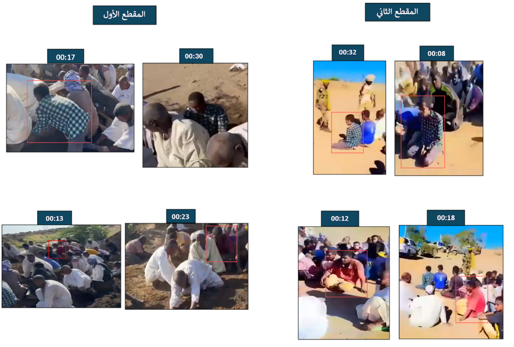 من خلال التحليل البصري للمقطع الثاني ومقارنته بالأول، اكتُشف وجود شخصين متطابقين على الأقل بين المقطعين، وهو ما قادنا إلى الاستنتاج بأن التعذيب في هذا المقطع مرتبط بذات الجريمة التي ارتكبها الدعم السريع في قرية “المعيلق”.