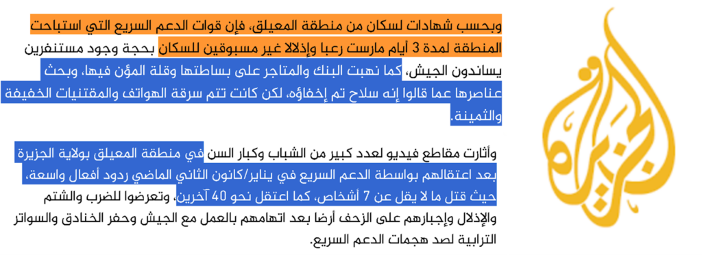 إذ كشفوا أن قوات الدعم، خلال اقتحامها لقرية “المعيلق” في 9 يناير/ كانون الثاني 2024، أعدمت ما لا يقل عن 7 مدنيين واعتقلت أكثر من 40 من أهالي البلدة، فضلًا عن نهبها للبنك والمتاجر والمقتنيات الشخصية للمدنيين هناك.