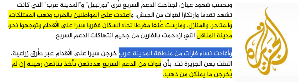 إذ أثبت -من خلال الأدلة المرئية- أن الانتهاكات بحق أهالي بلدة “المدينة عرب” ارتُكبت بعد سيطرة قوات الدعم السريع على القرية، ما يرجح مسؤوليتها عن هذه الجرائم. فكيف حدث ذلك؟