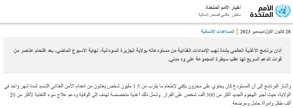 على رأس هذه التقارير ما أصدرته الأمم المتحدة في 28 ديسمبر/ كانون الأول 2028، إذ كشفت فيه عن سرقة ميليشيات حميدتي لمستودعات برنامج الغذاء العالمي في الولاية، ونهب أكثر من 2500 طن من محتوياتها.