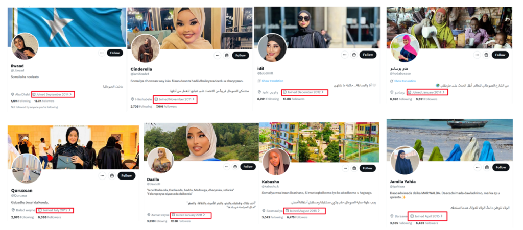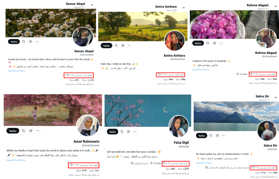 وما لفت النظر، خلال البحث، أن تاريخ تغيير البيانات هو ذاته الذي بدأ عنده النشاط الفعلي لهذه الحسابات. وهو ما يعزز فرضية اعتماد جزء من بناء الشبكة على شراء حسابات قديمة وإعادة تدويرها بهويات صومالية جديدة.