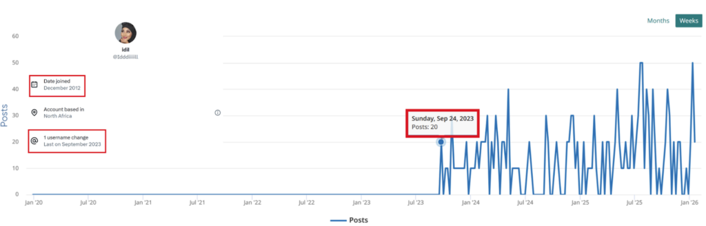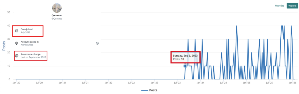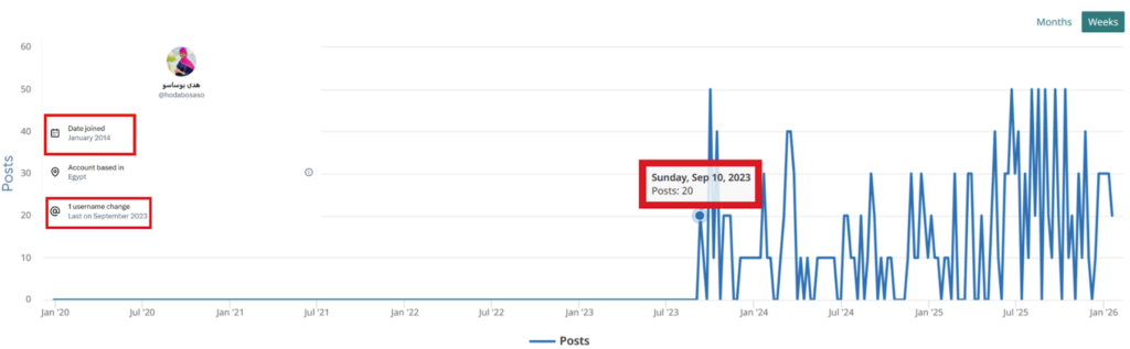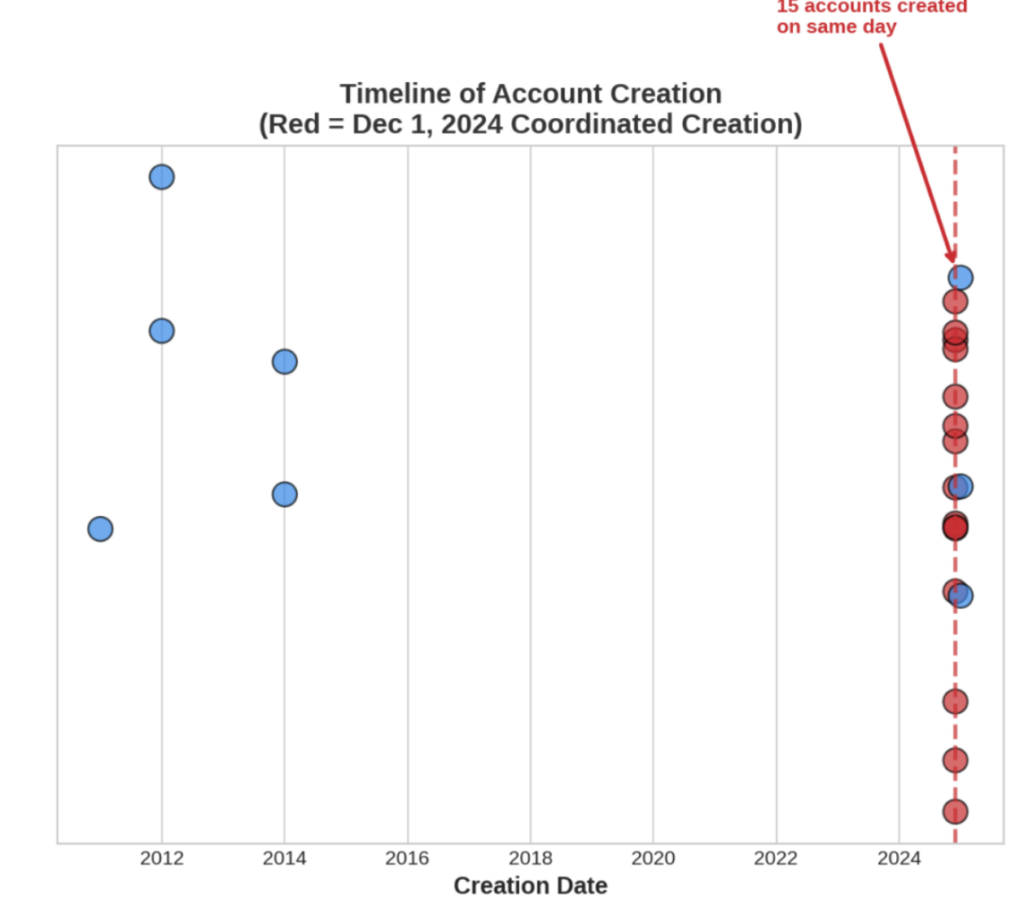 ما عزز شكوكنا حول هذه الحسابات المرصودة أن غالبيتها أُنشئ في ذات الفترة الزمنية تقريبًا، وتحديدًا في نهاية عام 2024.