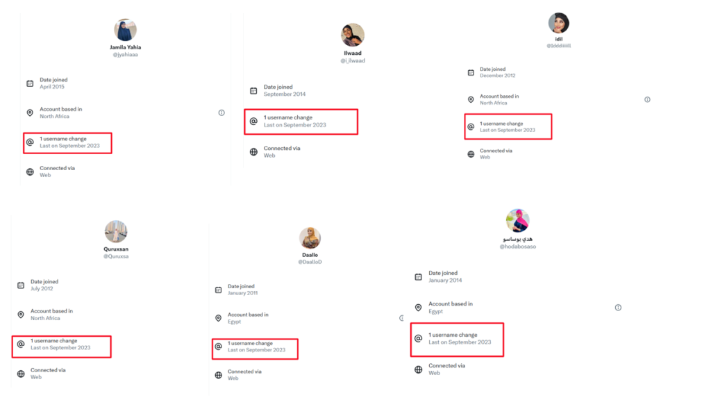 وبعد البحث والتتبع، تبين أن البيانات التعريفية لمعظم هذه الحسابات تغيرت في وقت واحد، خلال سبتمبر/ أيلول 2023، لتصطبغ بالهوية الصومالية.