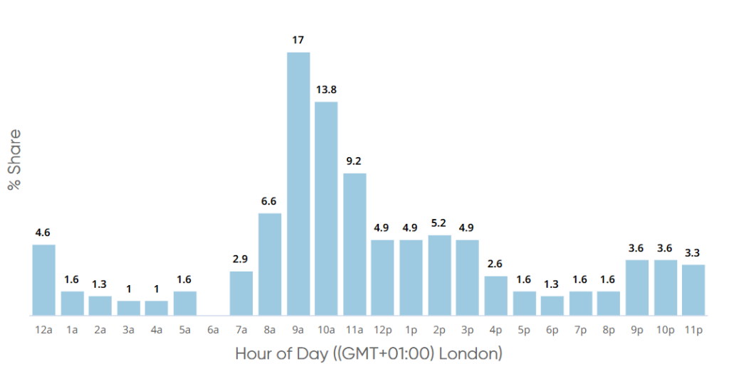 ووجدنا أن أكثر من نصف المنشورات -التي زاد عددها عن 3 آلاف تغريدة- تركز في مدة زمنية قصيرة لا يتجاوز مداها 4 ساعات متتالية فقط خلال اليوم، مع انخفاض حاد في معدل النشر قبل هذه الساعات وبعدها.
