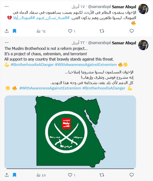 فعلى سبيل المثال، نجد أنها تشن حملة على جماعة الإخوان المسلمين وتصورهم كتهديد أمني للمنطقة، وتربطهم بحركة الشباب المجاهدين.
