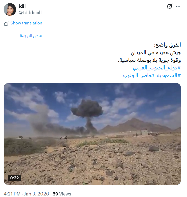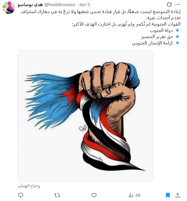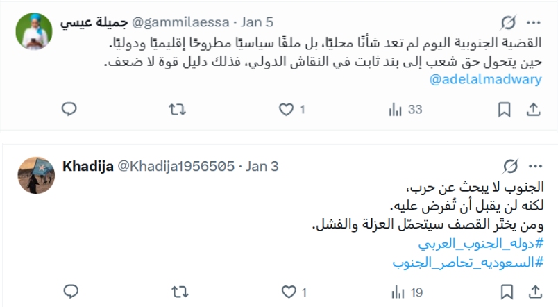 كما رُصدت منشورات تدعم انفصال جنوب اليمن، متبنية خطاب المجلس الانتقالي الداعي للانفصال، إلى جانب محتوى آخر حمل نبرة هجومية ضد السعودية. في ذات الوقت الذي تبنت فيه حسابات داعمة للإمارات نفس الخطاب.
