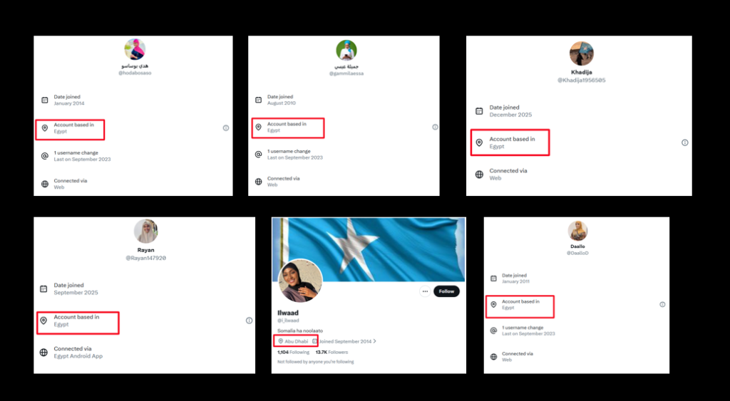 من المهم هنا الإشارة إلى أن بعض هذه الحسابات لا تُدار من داخل الصومال بالأساس، إذ تظهر مواقعها في دول مثل الإمارات ومصر.